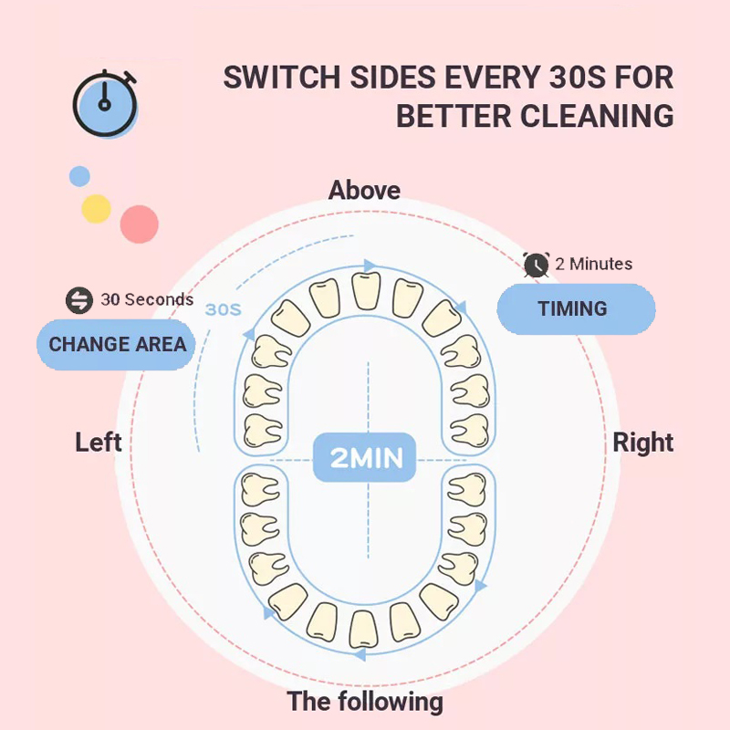 teeth for two minutes and divide teeth into four areas. Each area is cleaned